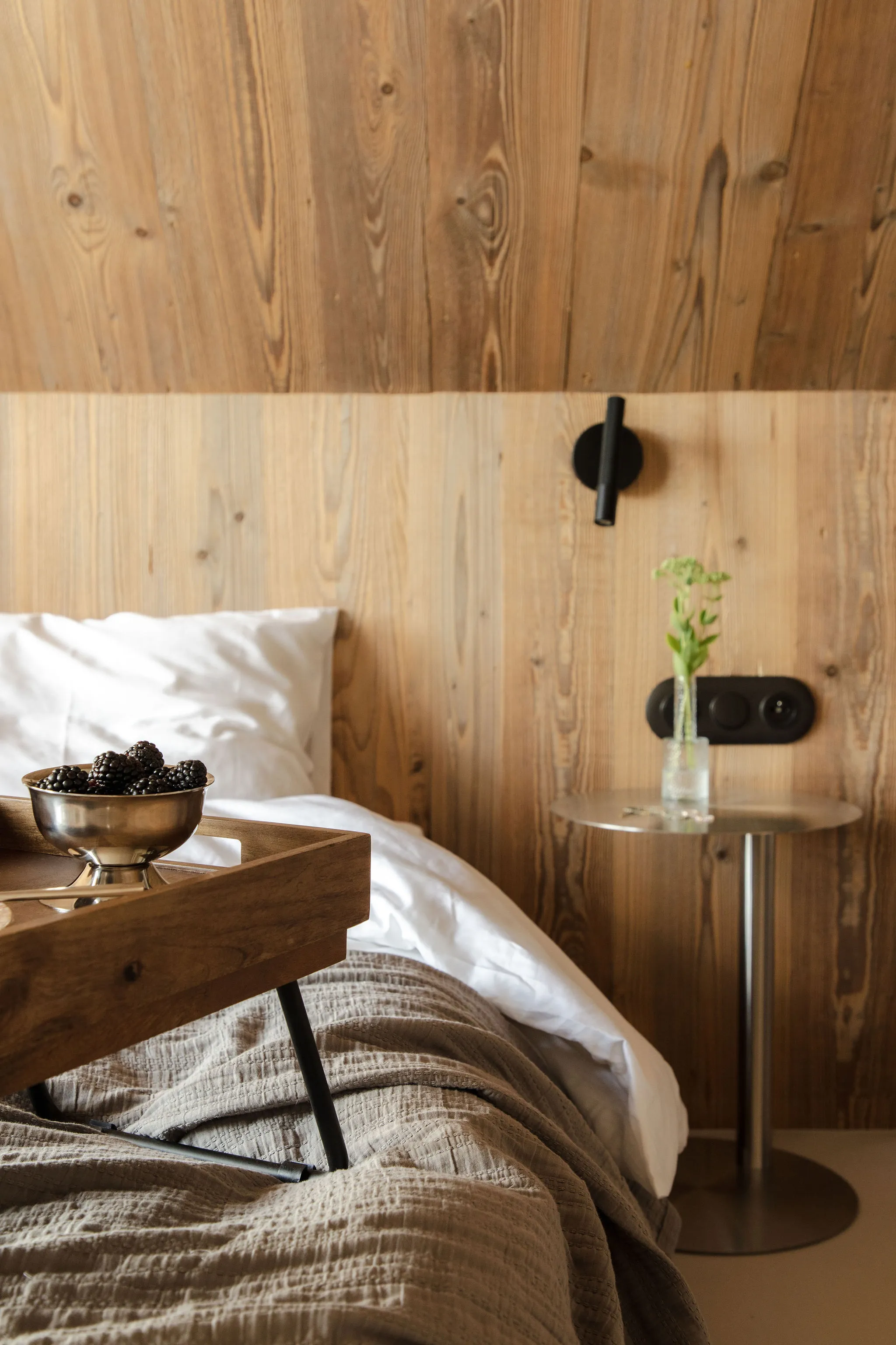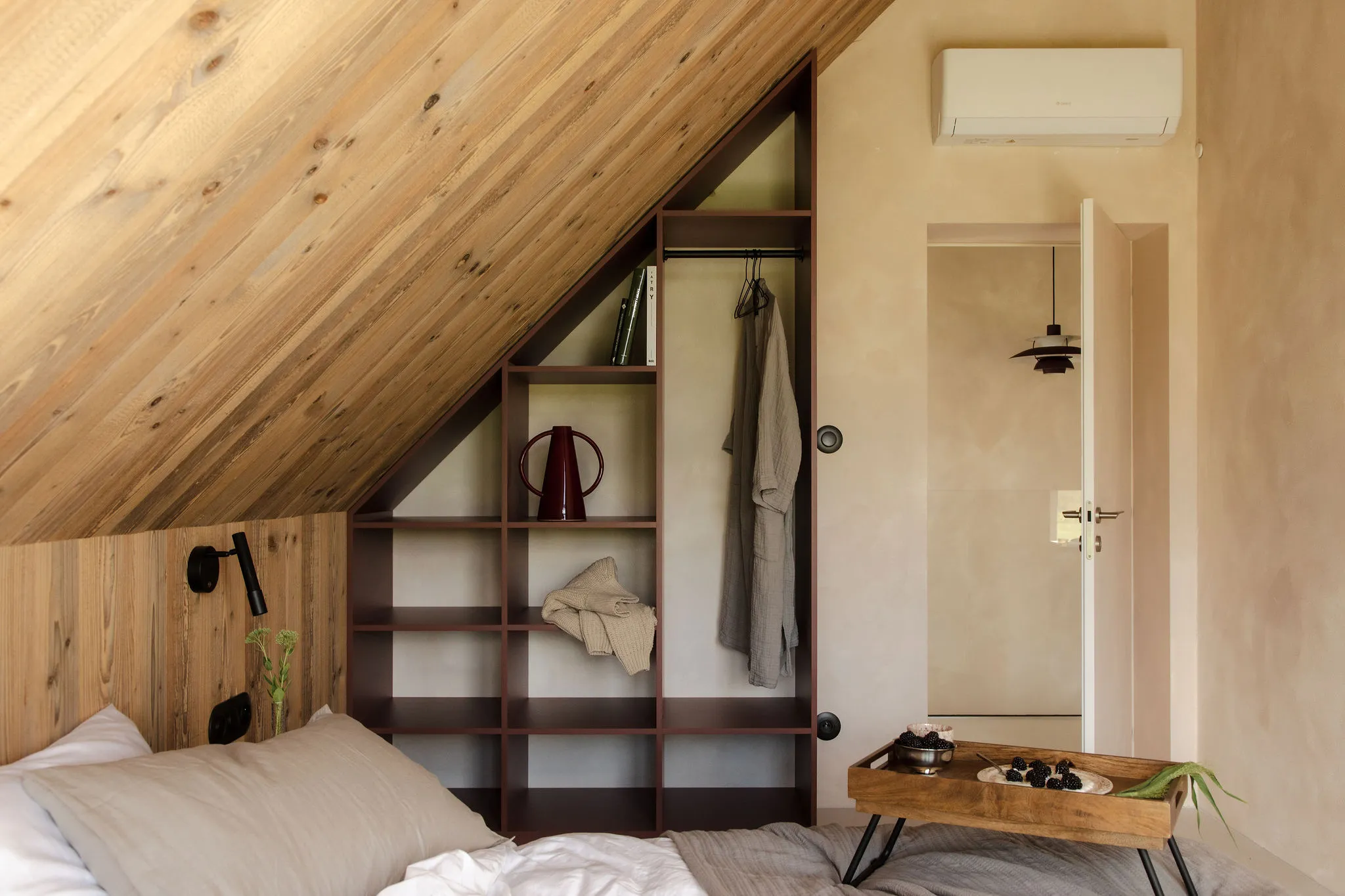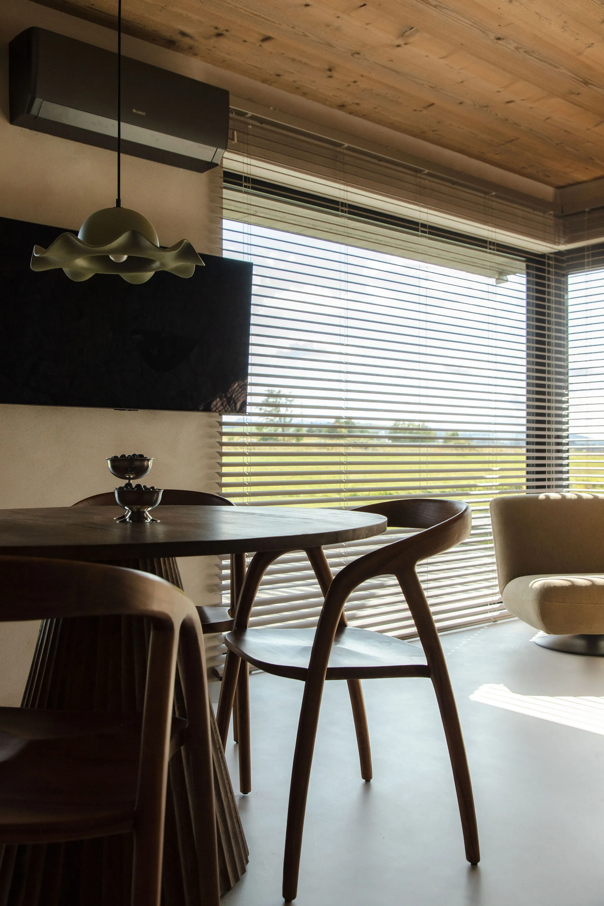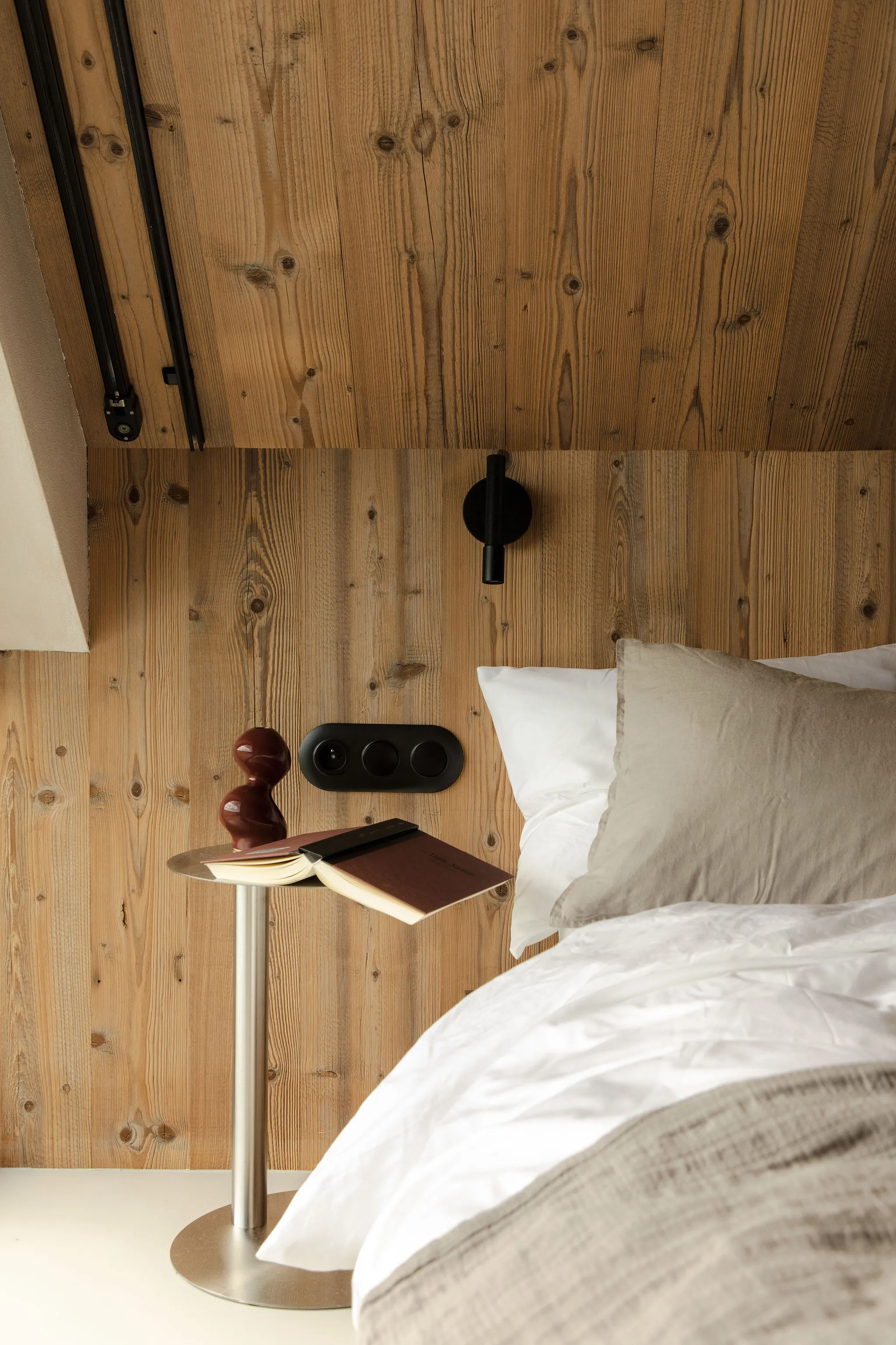 Surowa bryła z czarnym dachem kontrastuje z ciepłym drewnem wewnątrz.