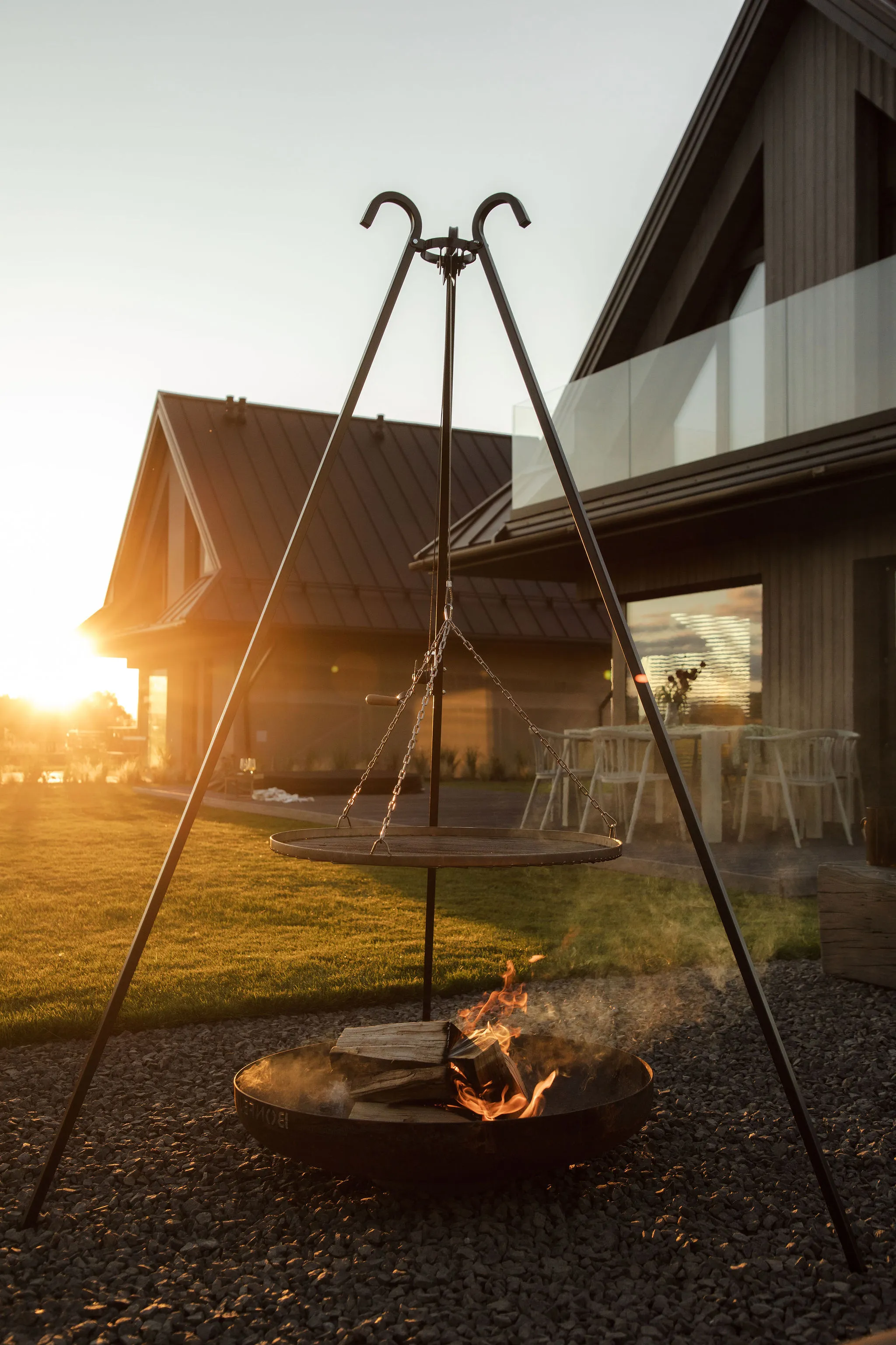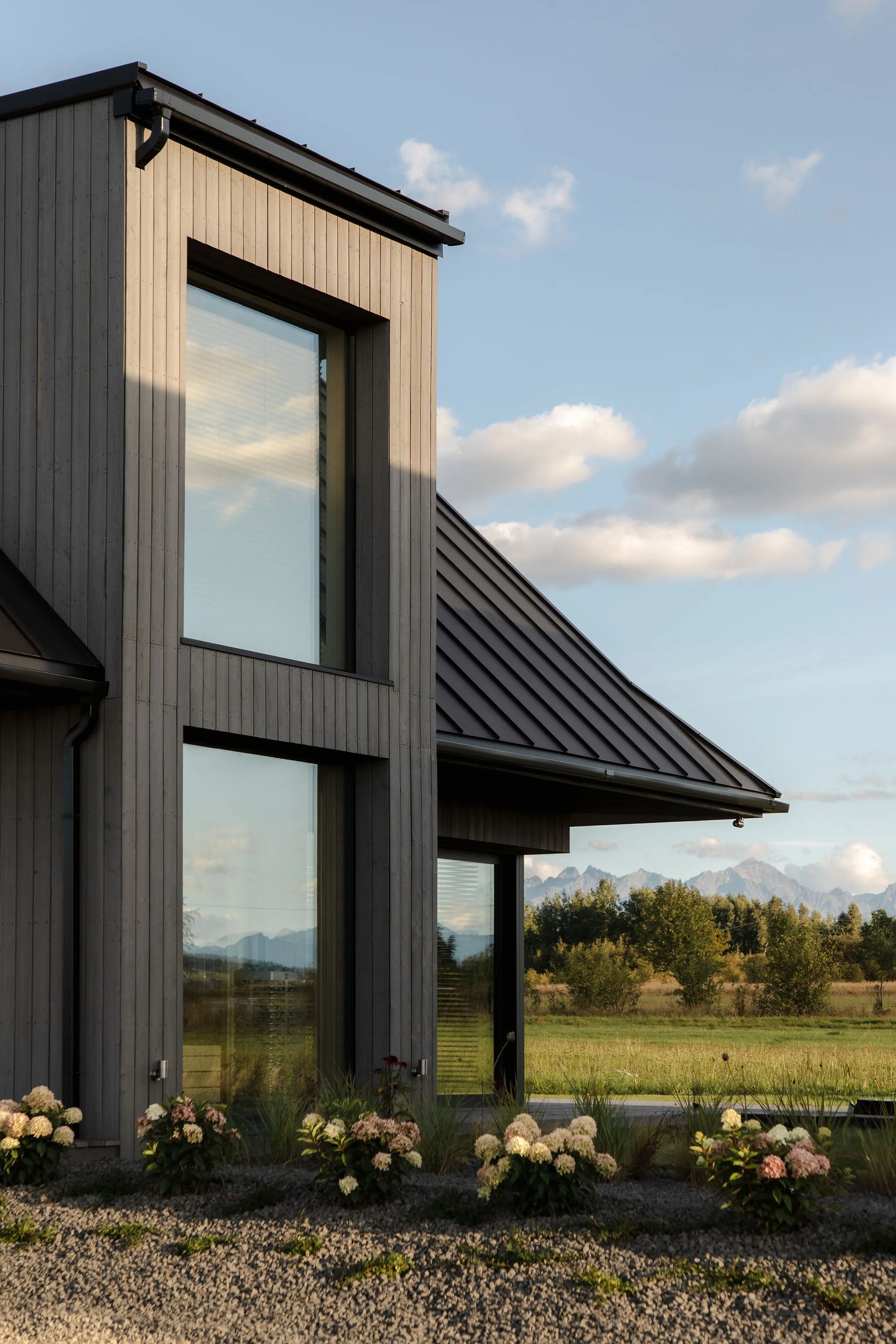 Wysokie okna kadrują panoramę łąk i Tatr, a przeszklony balkon i rozległy taras zapraszają do leniwego poranka z kawą.